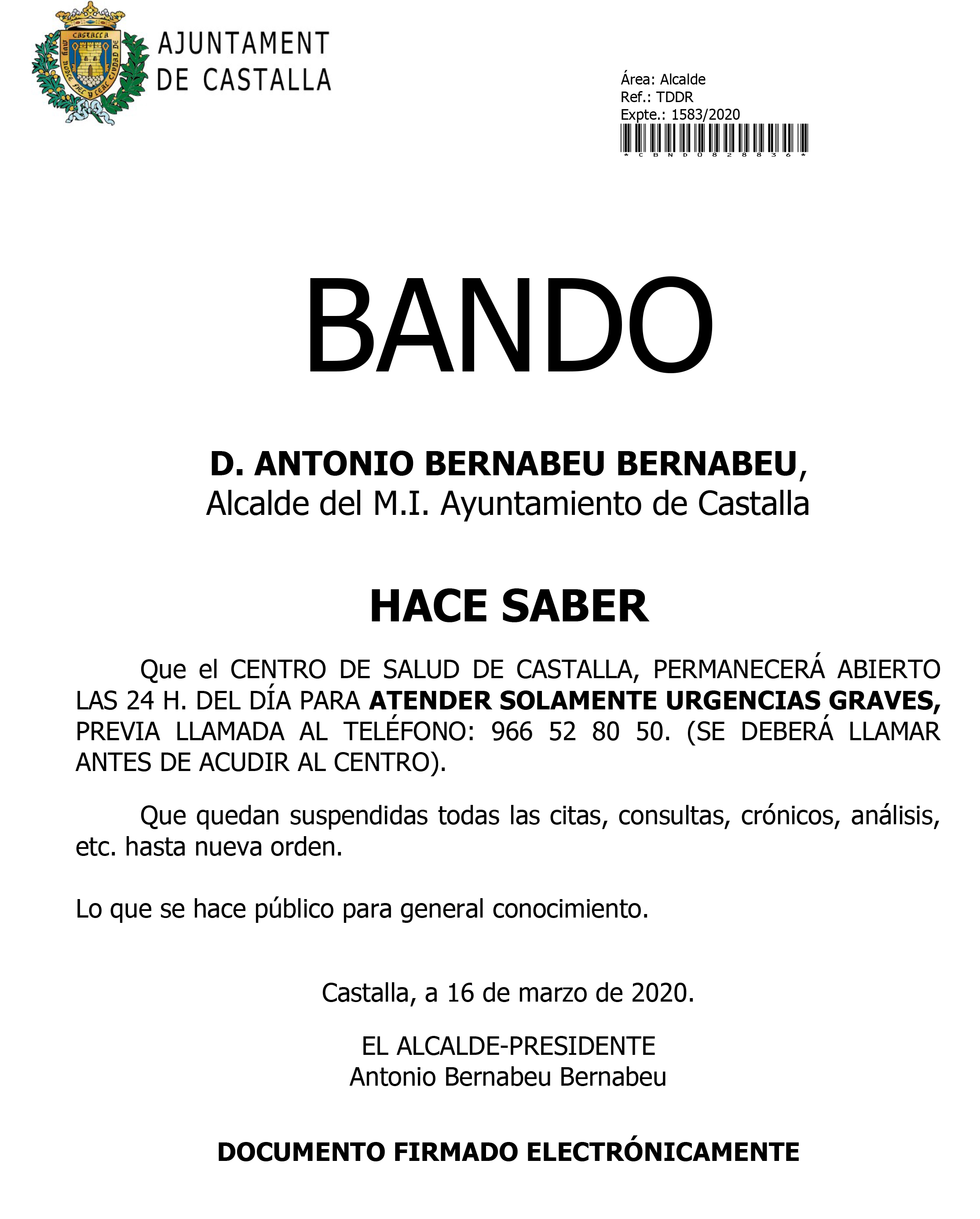 Bando de Don Antonio Bernabeu Bernabeu, Alcalde-Presidente del M.I. Ayuntamiento de Castalla, relativo al Centro de Salud de Castalla: