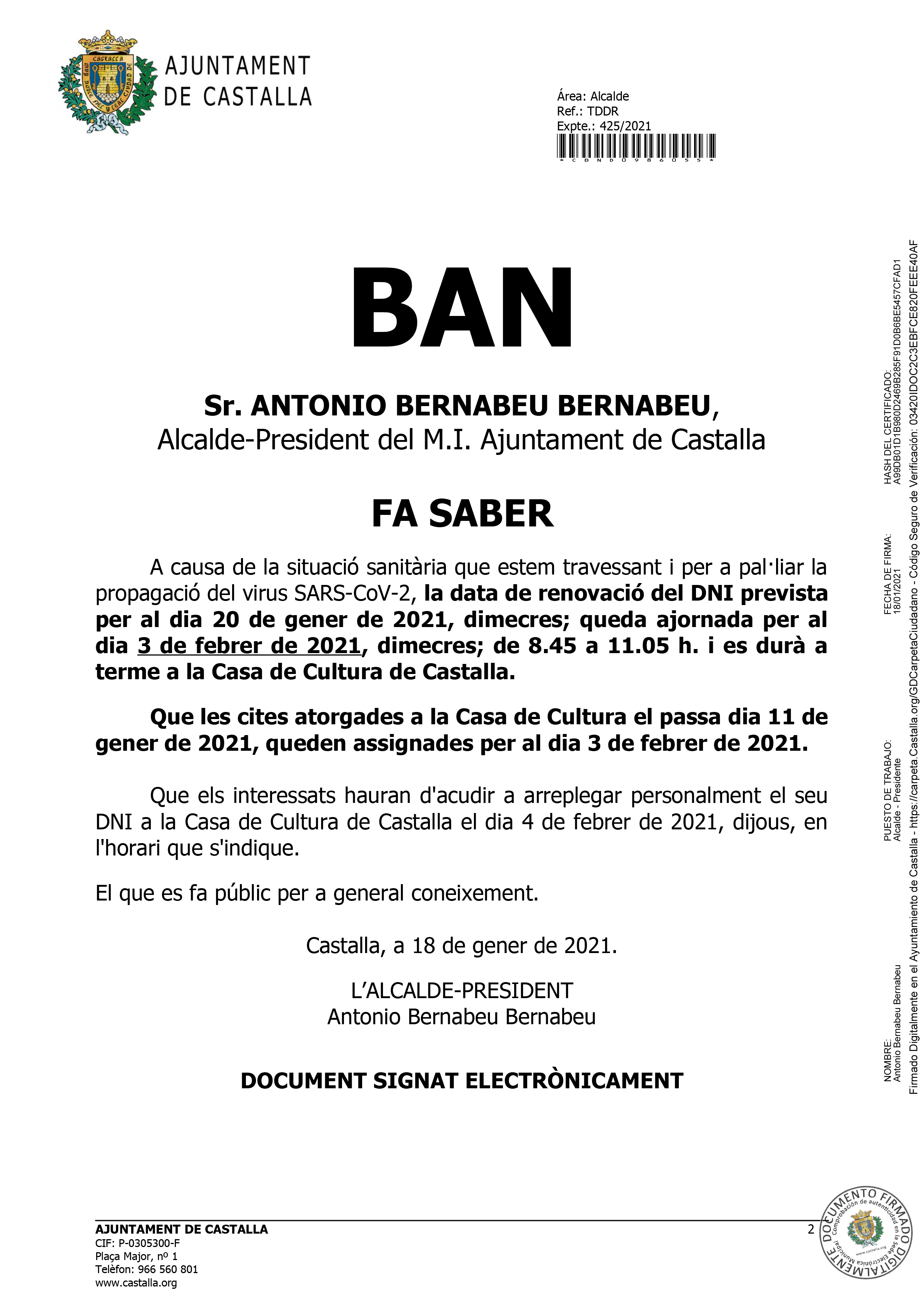 L’alcalde de Castalla, Antonio Bernabeu, ha comunicat mitjançant un ban municipal l’ajornament de la data de renovació del DNI, prevista pel 20 de gener, fins al 3 de febrer de 2021, en horari de 8:45 hores a la Casa de Cultura. L’objectiu d’aquesta mesura és frenar la propagació de la Covid-19.