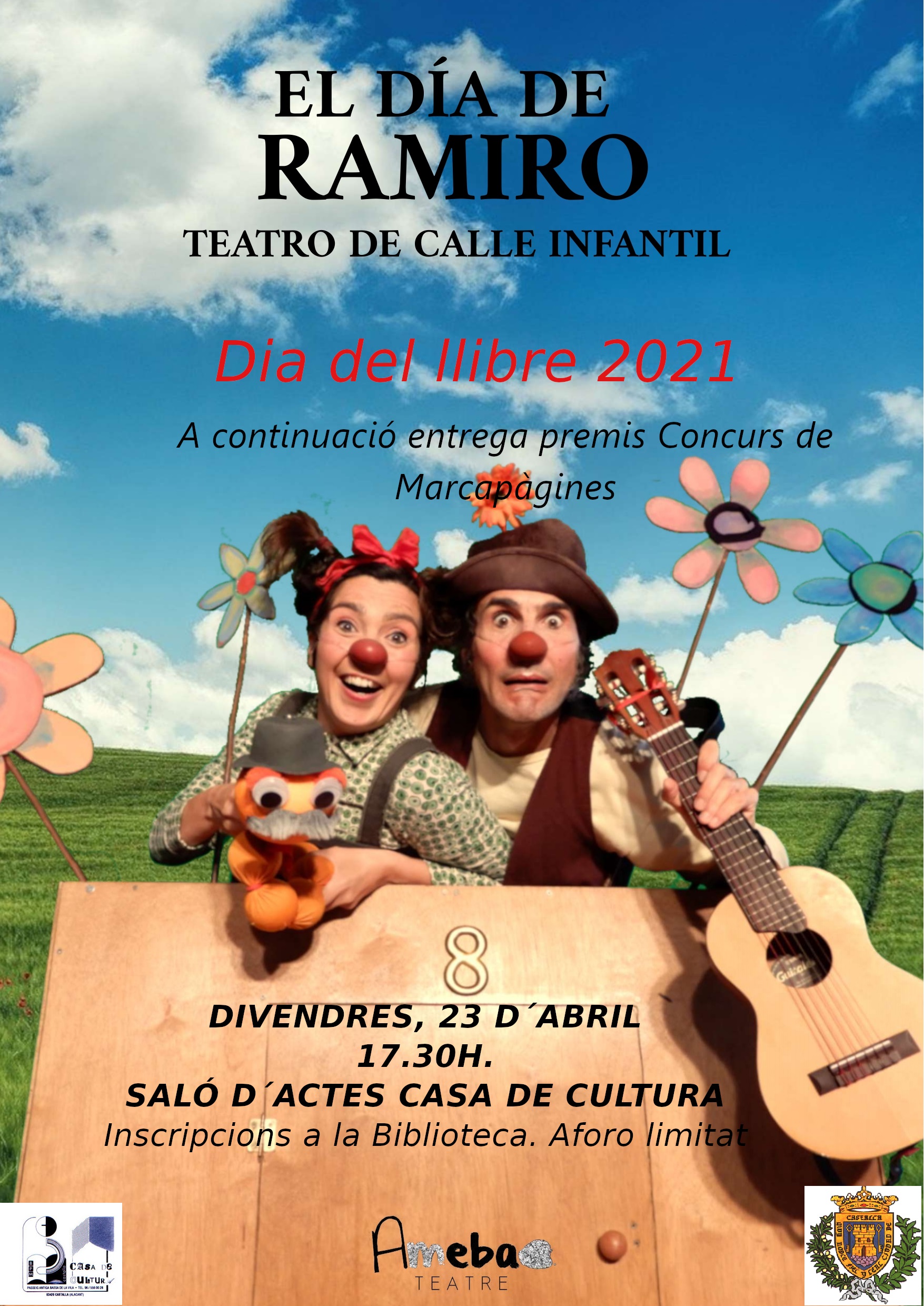 El próximo viernes 23 de abril es el Día del Libro y este año si que lo podemos celebrar como es debido, por eso hemos preparado un teatro familiar “El Día de Ramiro” de la mano de la compañía Ameba Teatre, que conjuga narración oral, marionetas, clown y música en directo.