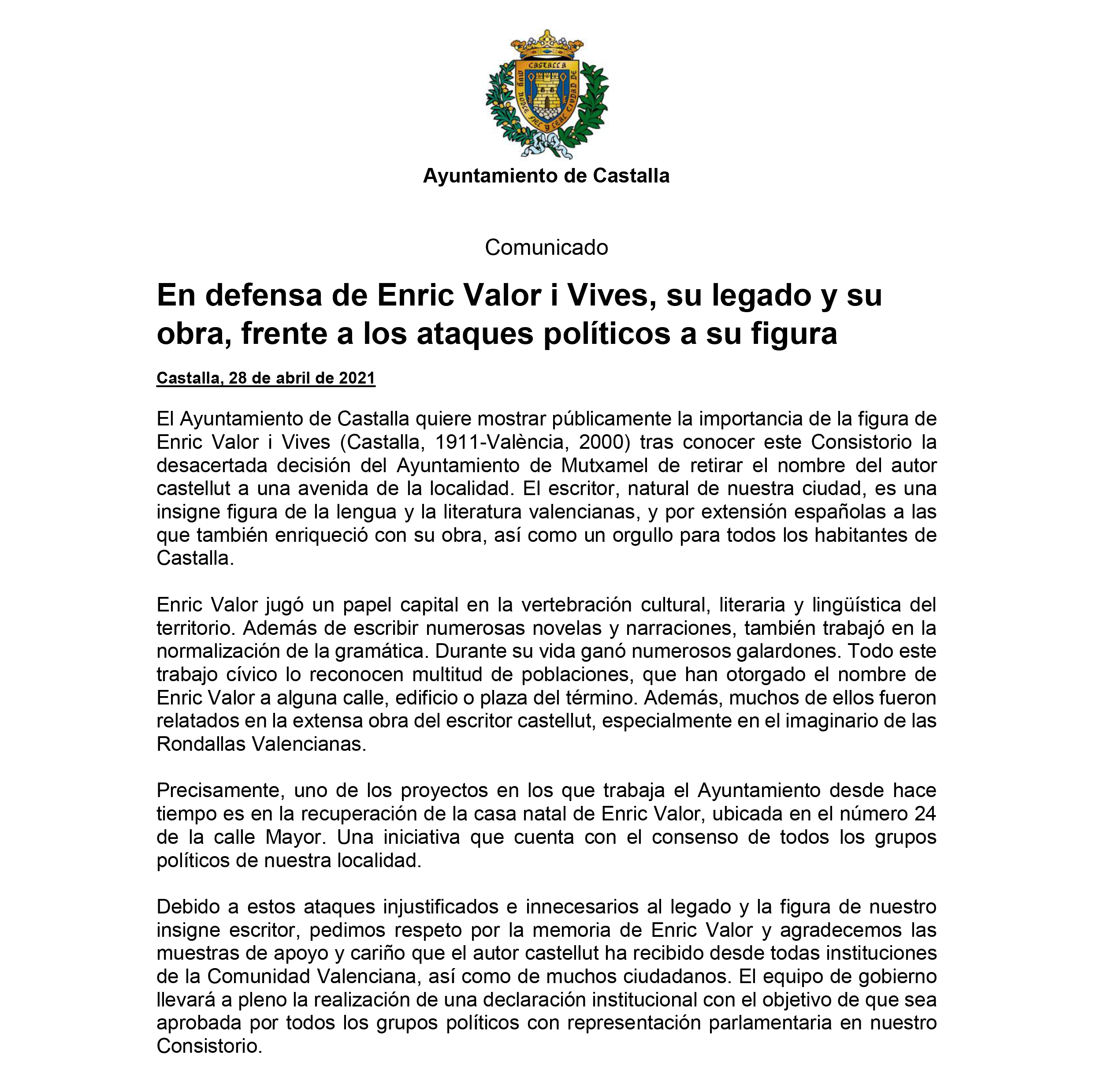 Debido a estos ataques injustificados e innecesarios al legado y la figura de nuestro insigne escritor, pedimos respeto por la memoria de Enric Valor y agradecemos las muestras de apoyo y cariño que el autor castellut ha recibido desde todas instituciones de la Comunidad Valenciana, así como de muchos ciudadanos. El equipo de gobierno llevará a pleno la realización de una declaración institucional con el objetivo de que sea aprobada por todos los grupos políticos con representación parlamentaria en nuestro Consistorio.