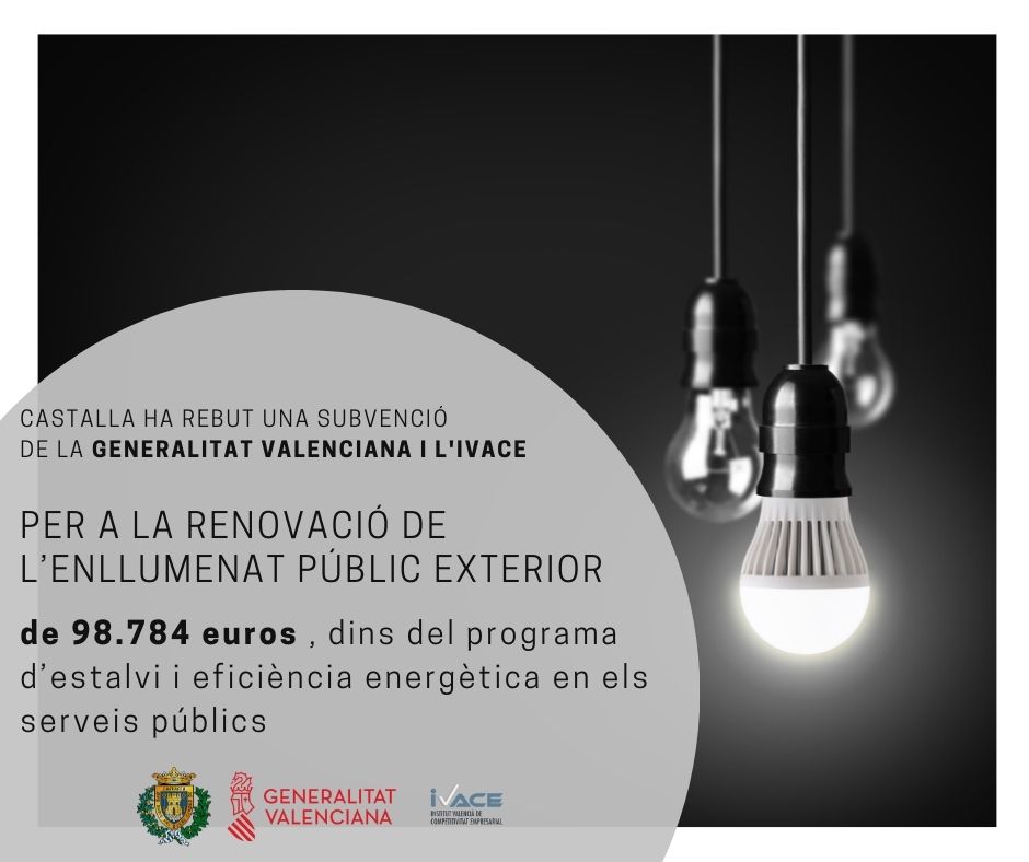 L’Ajuntament de Castalla ha rebut una subvenció de l’IVACE per a la renovació de l’enllumenat públic exterior existent per valor de 98.784 euros, dins del programa d’estalvi i eficiència energètica en els serveis públics.