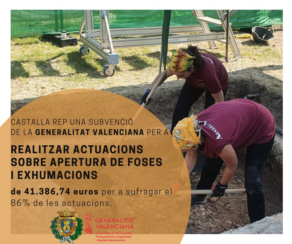 El Ayuntamiento de Castalla ha recibido una subvención de la Conselleria de Participación, Transparencia, Cooperación y Calidad Democrática de la Generalitat Valenciana por valor de 41.386,74 euros para realizar actuaciones sobre apertura de fosas y exhumaciones. La ayuda corresponde al 86% de la actuación, que tiene un coste total de 48.124,12 euros.