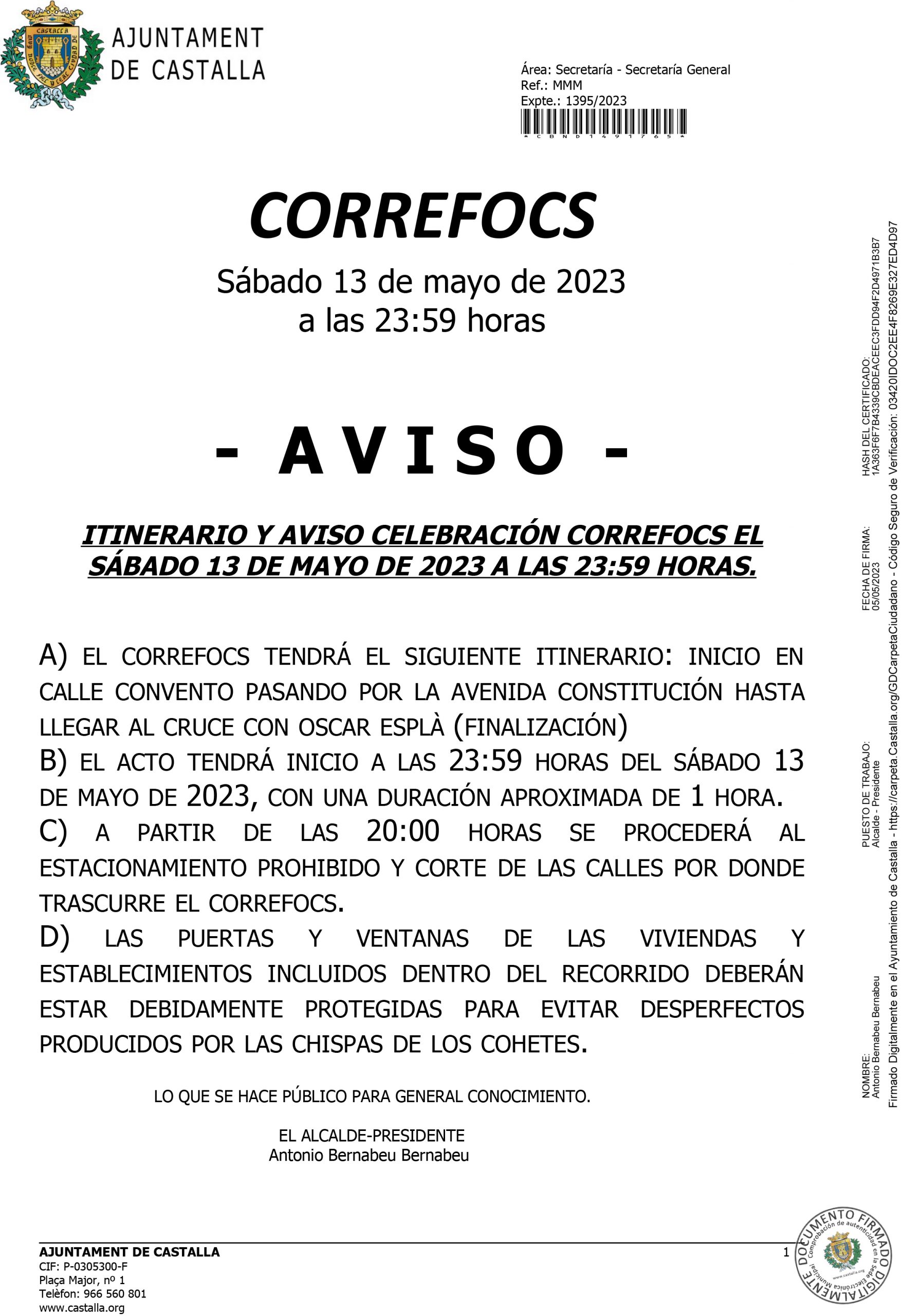 Nota informativa con motivo de la celebración del Correfocs durante la Feria de San Isidro 2023 en las calles de Castalla el día 13 de mayo a las 23:59 horas.