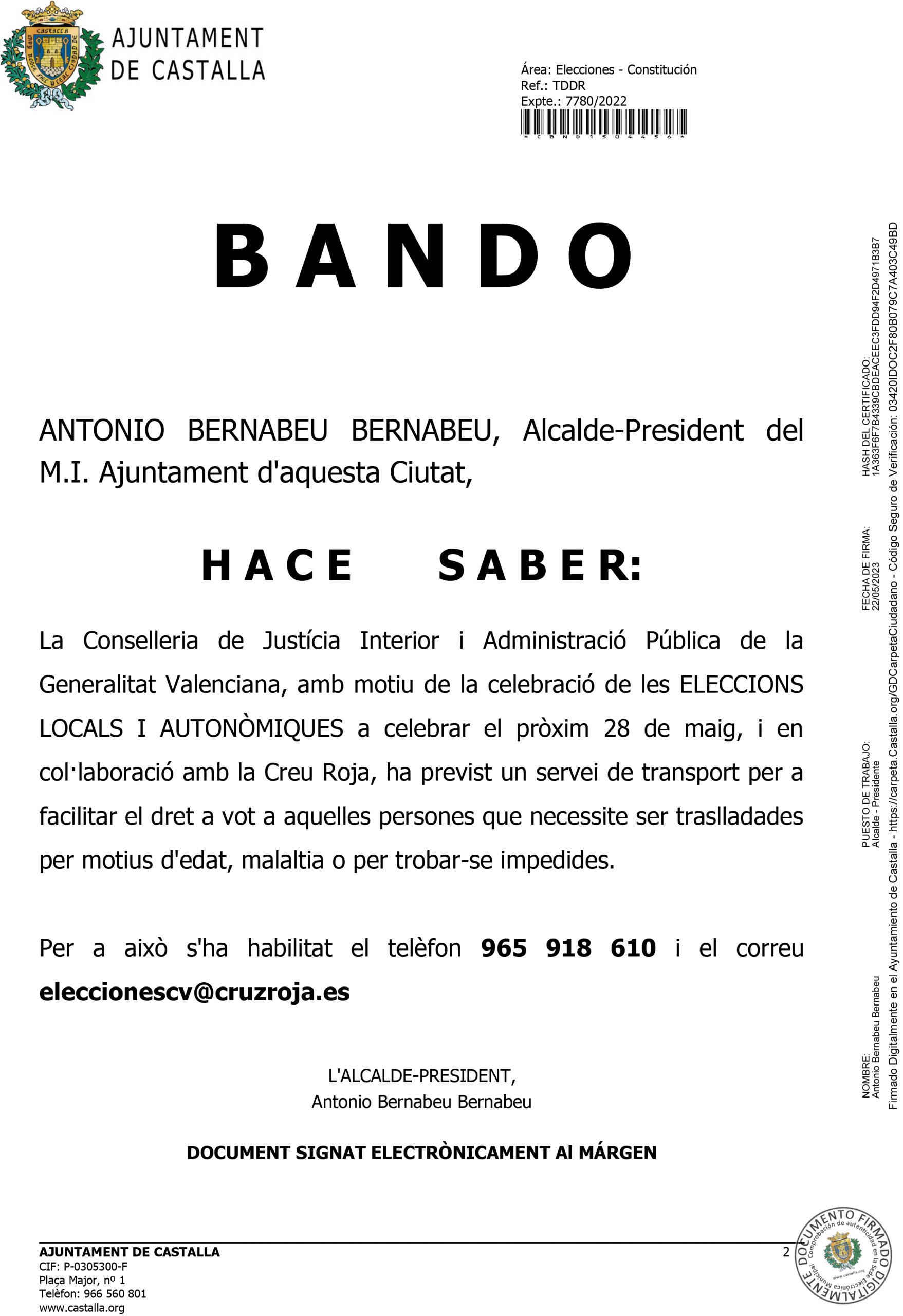 La Conselleria de Justícia Interior i Administració Pública de la Generalitat Valenciana, en col·laboració amb Creu Roja, ha previst un servei de transport per a facilitar el dret a vot en les pròximes eleccions locals i autonòmiques del 28 de maig.