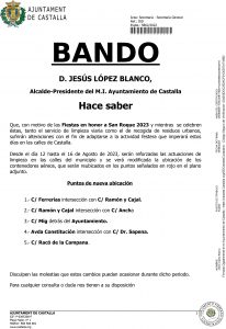 L’alcalde de Castalla, Jesús López, ha publicat un Ban Municipal per a informar dels canvis en els serveis de neteja viària i la recollida de residus durant les Festes en honor  a Sant Roc 2023.