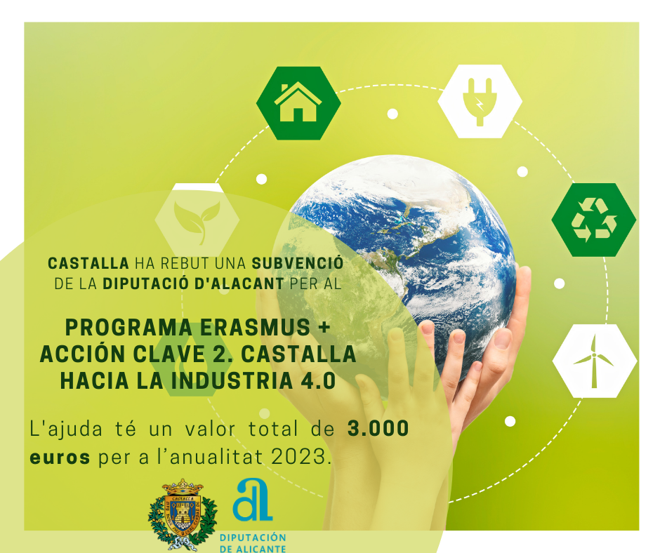 L’Ajuntament de Castalla ha rebut una subvenció de la Diputació d’Alacant de 3.000 euros pel programa ERASMUS + Acció clau 2. L’ajuda s’ha dirigit al projecte ‘Castalla cap a la industria 4.0”, amb l’objectiu de compartir bones pràctiques en l’àmbit de la industria 4.0 verda i sostenible implicant al sector industrial i als clúster industrials.