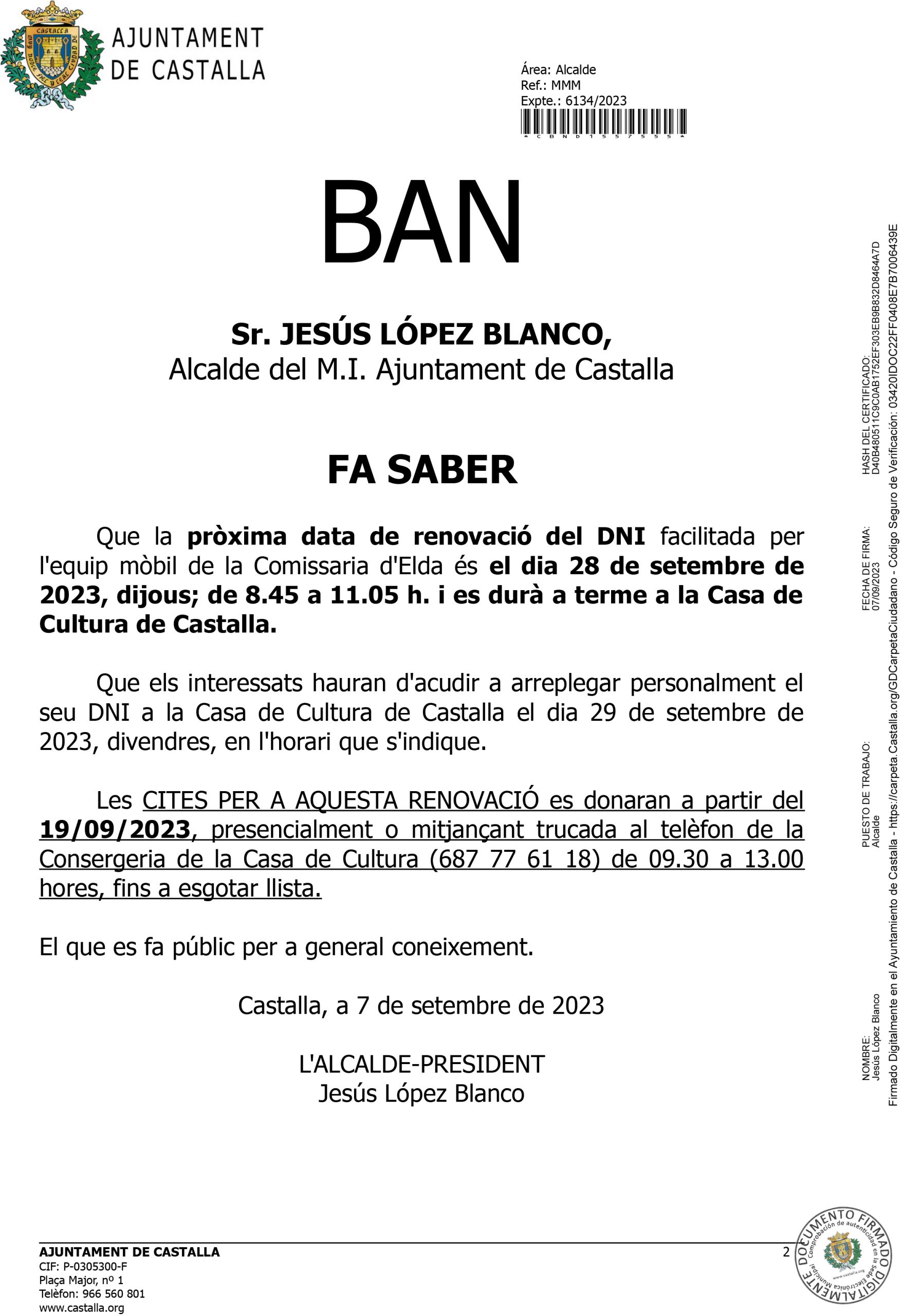 Ban municipal de l’Ajuntament de Castalla per a informar a la ciutadania sobre la pròxima data de renovació del DNI. L’equip mòbil de la Comissaria d’Elda estarà a la nostra ciutat el dijous dia 28 de setembre entre les 8:45 i les 11:05 hores.