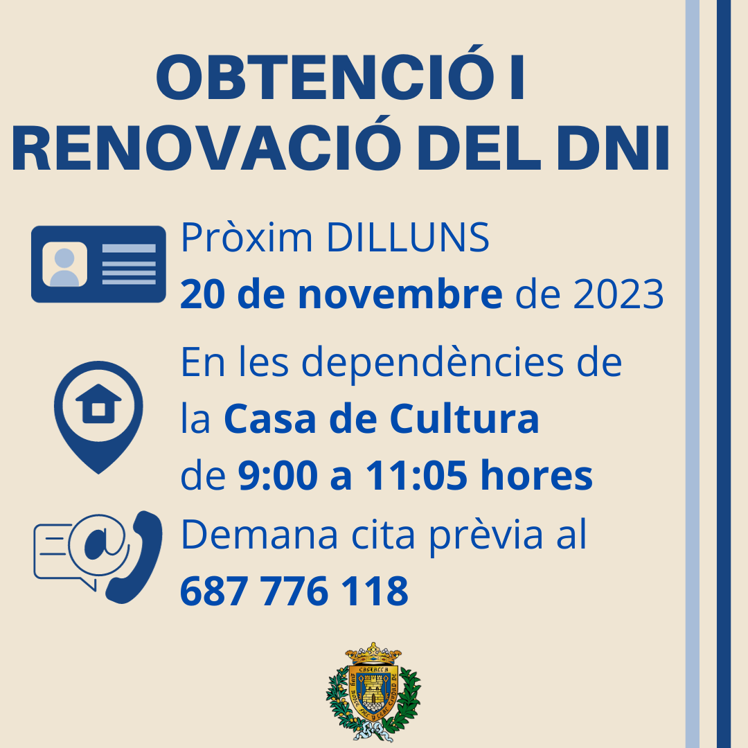 Per a aquesta data de renovació s’assignen les cites presencialment o a través del telèfon de la consergeria de la Casa de Cultura 687 77 61 18 o presencialment de 9:00 a 13:00 hores, a partir del dia 13 de novembre.
