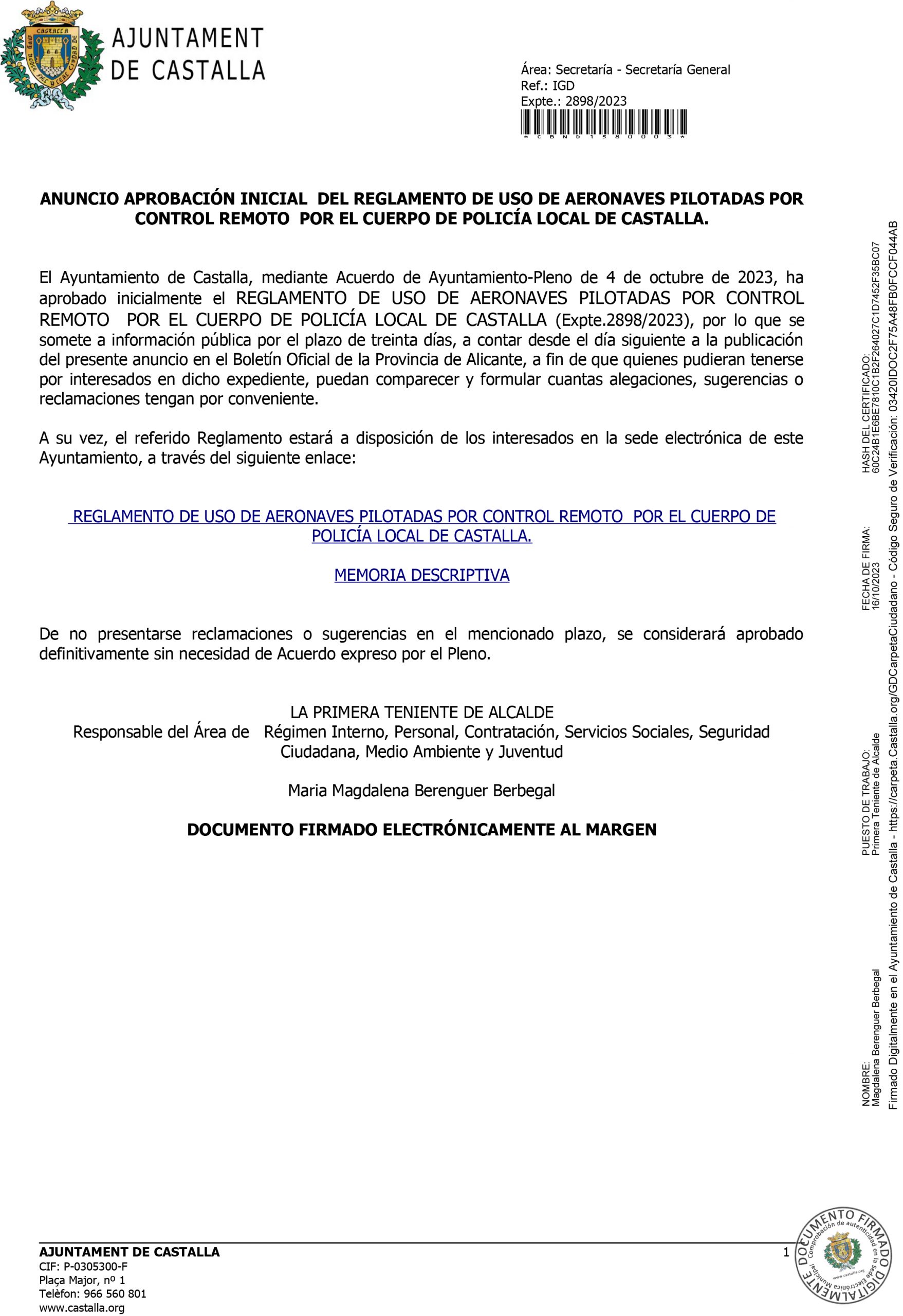 ANUNCIO APROBACIÓN INICIAL DEL REGLAMENTO DE USO DE AERONAVES PILOTADAS POR CONTROL REMOTO POR EL CUERPO DE POLICÍA LOCAL DE CASTALLA