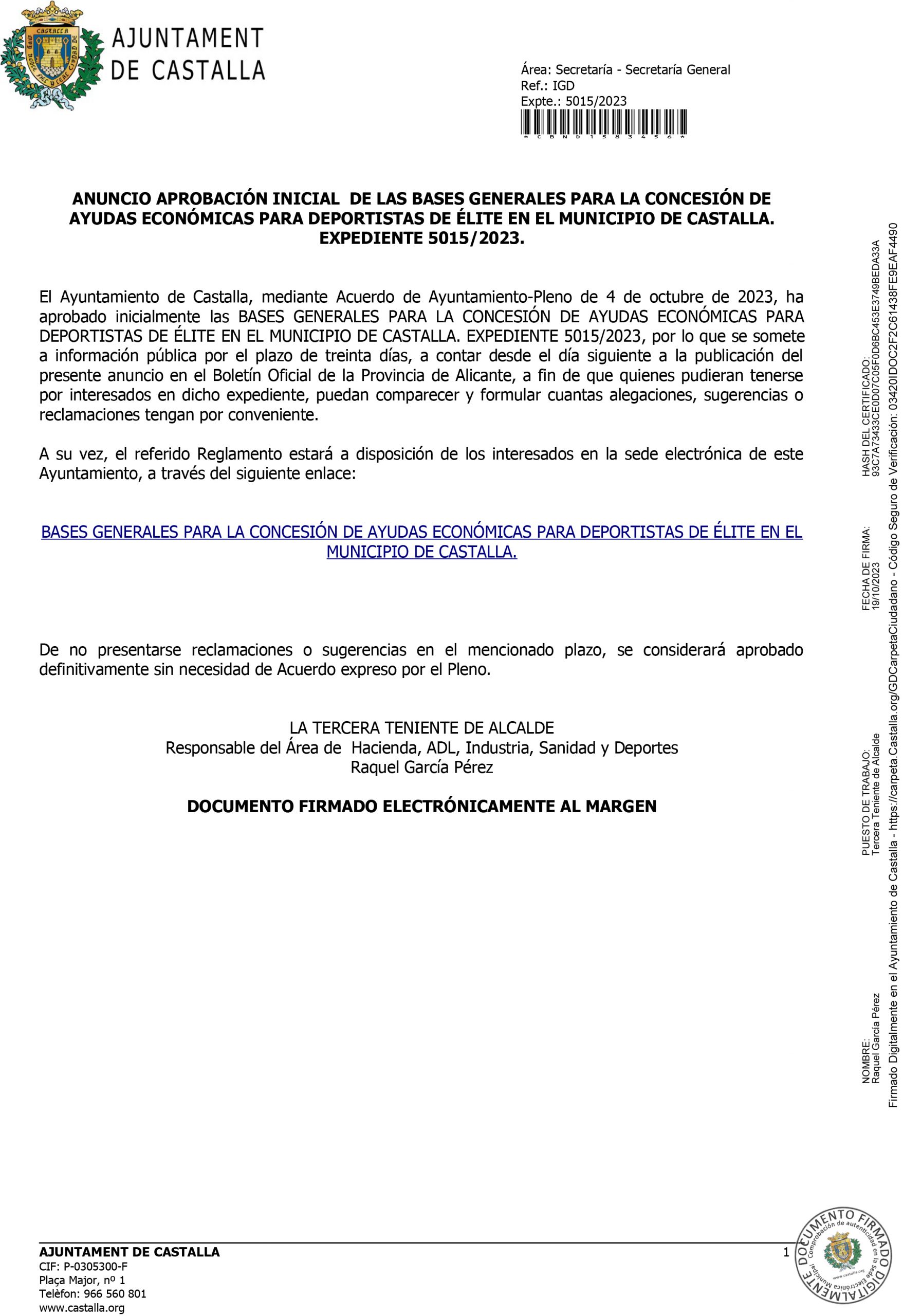 ANUNCIO APROBACIÓN INICIAL DE LAS BASES GENERALES PARA LA CONCESIÓN DE AYUDAS ECONÓMICAS PARA DEPORTISTAS DE ÉLITE EN EL MUNICIPIO DE CASTALLA. EXPEDIENTE 5015/2023