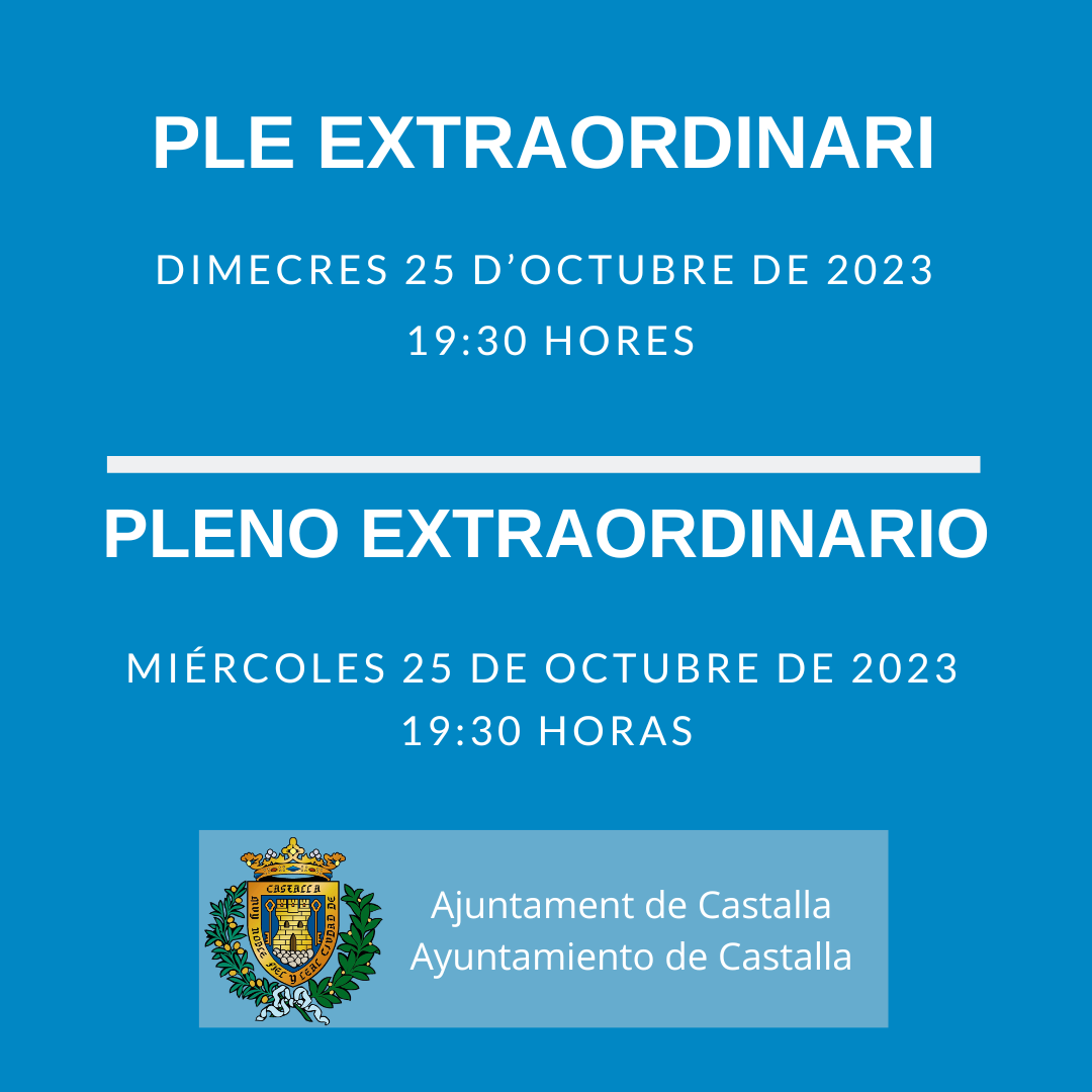 L’Ajuntament de Castalla ha convocat una sessió de Plenari Extraordinari per al dimecres 25 d’octubre de 2023 a les 19:30 hores. La sessió tindrà lloc a la Sala de Reunions de la primera planta de l’edifici municipal.