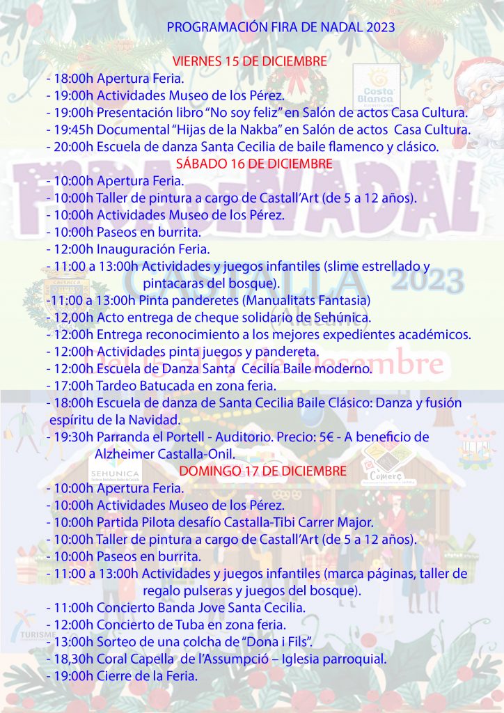 L’encarregat de desgranar el programa ha sigut l’edil de Turisme i Comerç, José Rico, qui ha comentat que la Fira de Nadal començarà el divendres 15 de desembre a les 18.00 hores. Eixa vesprada hi haurà activitats en el Museu dels Pérez a les 19.00 hores; la presentació del llibre ‘No soc feliç’ en el saló de cultura de les 18.00 les 20.00 hores, la projecció del documental ‘Filles de la Nakba’ a les 19.45 hores i la representació de ball a càrrec de l’Escola de Dansa Santa Cecilia de ball flamenc i clàssic a les 20.00 hores.