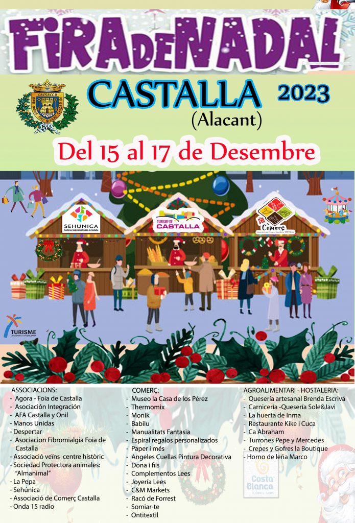 Castalla acollirà els dies 15, 16 i 17 de desembre la Fira de Nadal 2023. Una cita indispensable que omplirà els carrers d’activitats per a tots els públics. Així ho ha transmés l’alcalde de la localitat, Jesús López, qui ha explicat que “tenim tres dies per davant per a gaudir en família i de la nostra localitat i esperem que el gaudisquen tots els veïns i veïnes”. El primer edil ha assegurat que “l’objectiu d’esta Fira és dinamitzar el comerç local, al qual vull agrair la seua col·laboració i participació en este esdeveniment, així com conéixer Castalla d’una manera diferent i en un ambient nadalenc”. A més, el primer edil ha agraït també la col·laboració de l’Associació de Comerç i Hostaleria de Castalla, així com a Sectors Hostalers Units de Castalla (Sehunica) i a Turisme de Castalla.