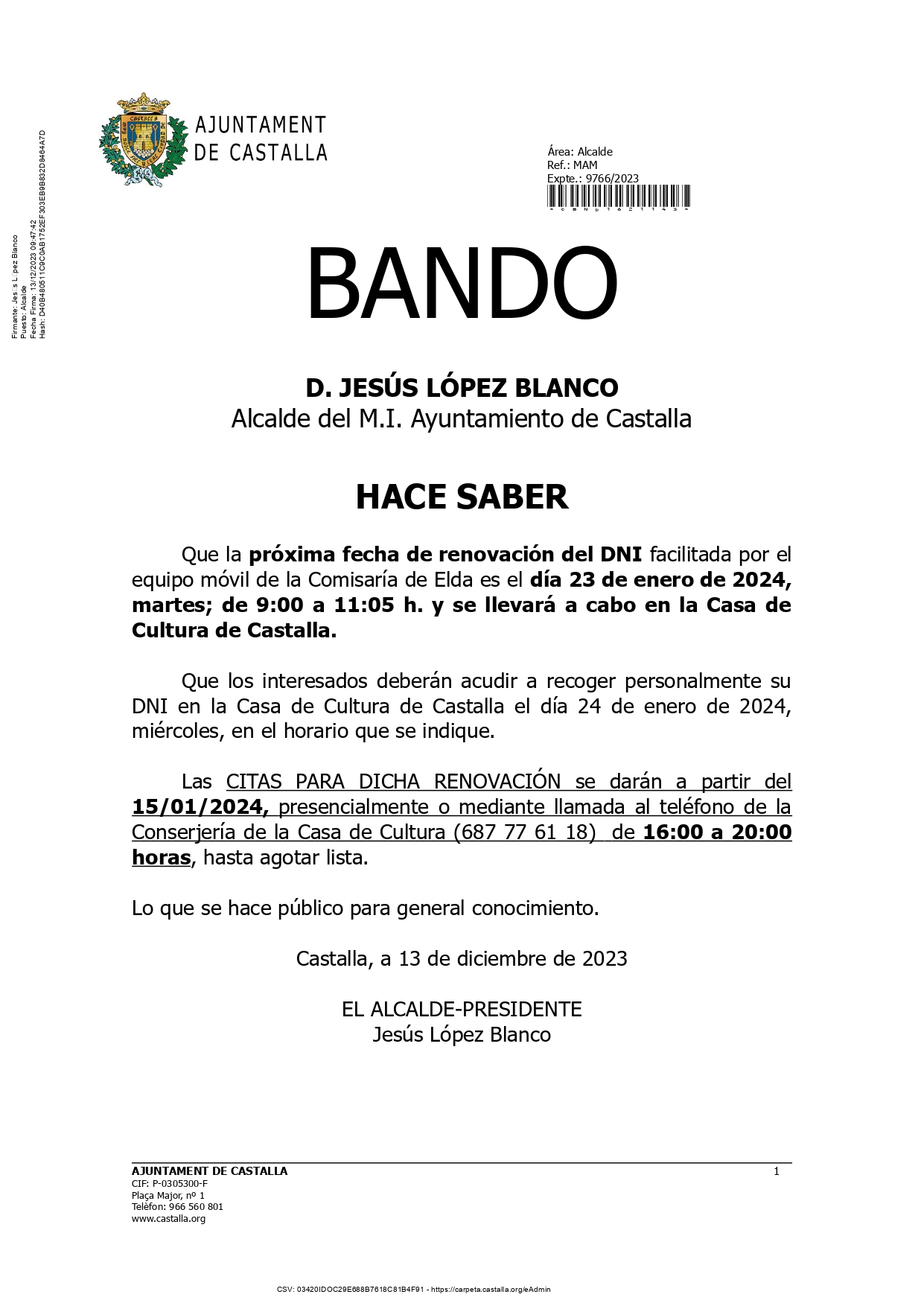 El alcalde de Castalla, Jesús López Blanco, ha informado a través de un Bando Municipal de la próxima fecha para la renovación del DNI, facilitada por el equipo móvil de la Comisaría de Elda.