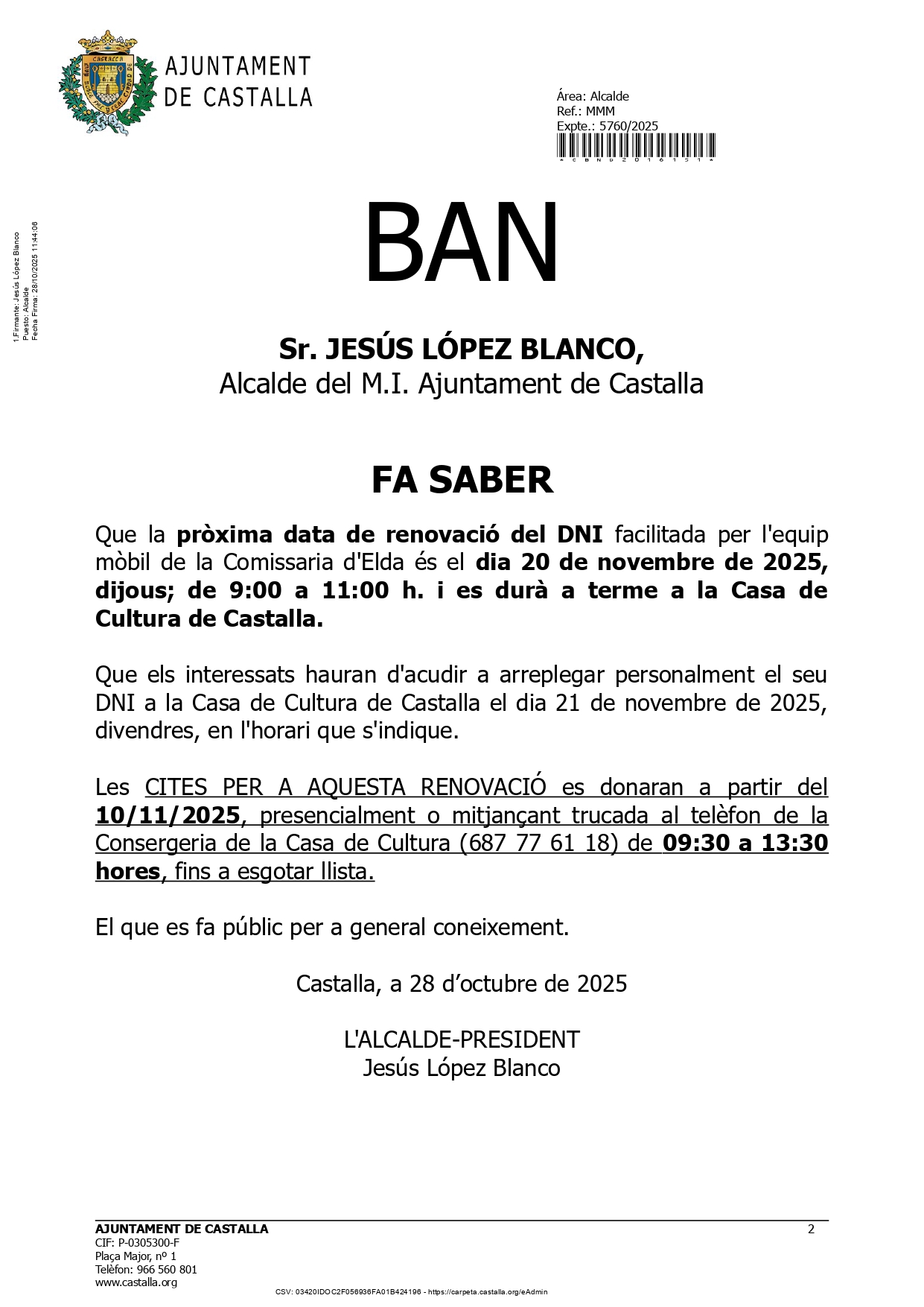 L’alcalde de Castalla, Jesús López Blanco, ha informat a través d’un Ban Municipal de la pròxima convocatòria per a la renovació del DNI, facilitada per l’equip mòbil de la Comissaria d’Elda.