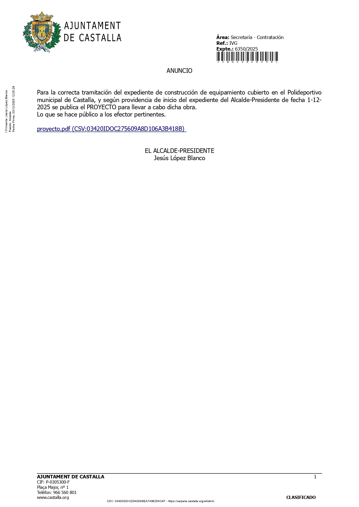 Para la correcta tramitación del expediente de construcción de equipamiento cubierto en el Polideportivo municipal de Castalla, se publica el Proyecto que se puede consultar aquí