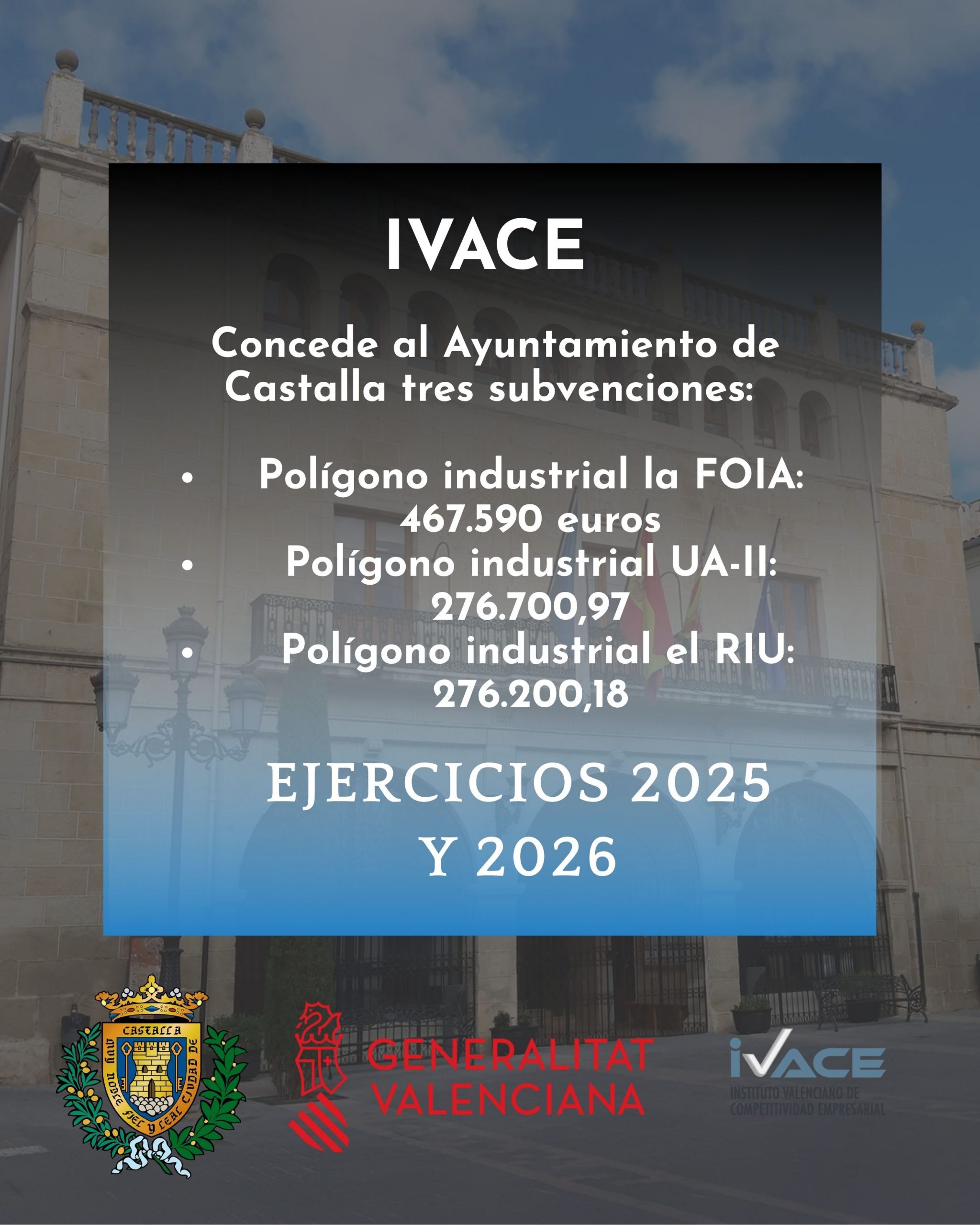 El INSTITUTO VALENCIANO DE COMPETITIVIDAD EMPRESARIAL (IVACE) ha concedido al Ayuntamiento de Castalla, dentro de la convocatoria de ayudas para proyectos de inversión para la mejora, modernización y dotación de infraestructuras y servicios en polígonos, áreas industriales y enclaves tecnológicos, para los ejercicios 2025 y 2026, las siguientes subvenciones: