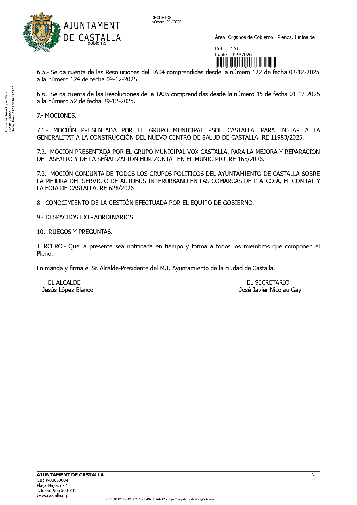 Se convoca un Pleno Ordinario para el 28 de enero de 2026. A las 19:30 horas en el Salón de Plenos.